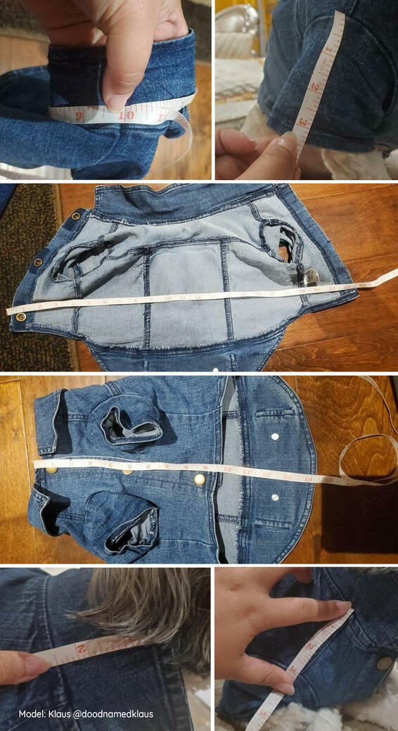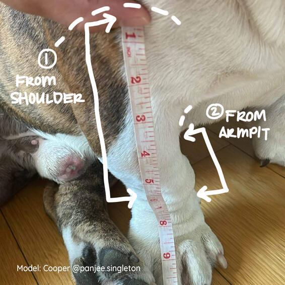 Measure your pet's leg length starting from the shoulder OR the armpit. Please stop at least 2 inches from the floor so you pet's leg won't slip out of the sleeve.Also, do let me know if you used the shoulder or armpit as a basis so we're on the same page!This measurement is most useful for: